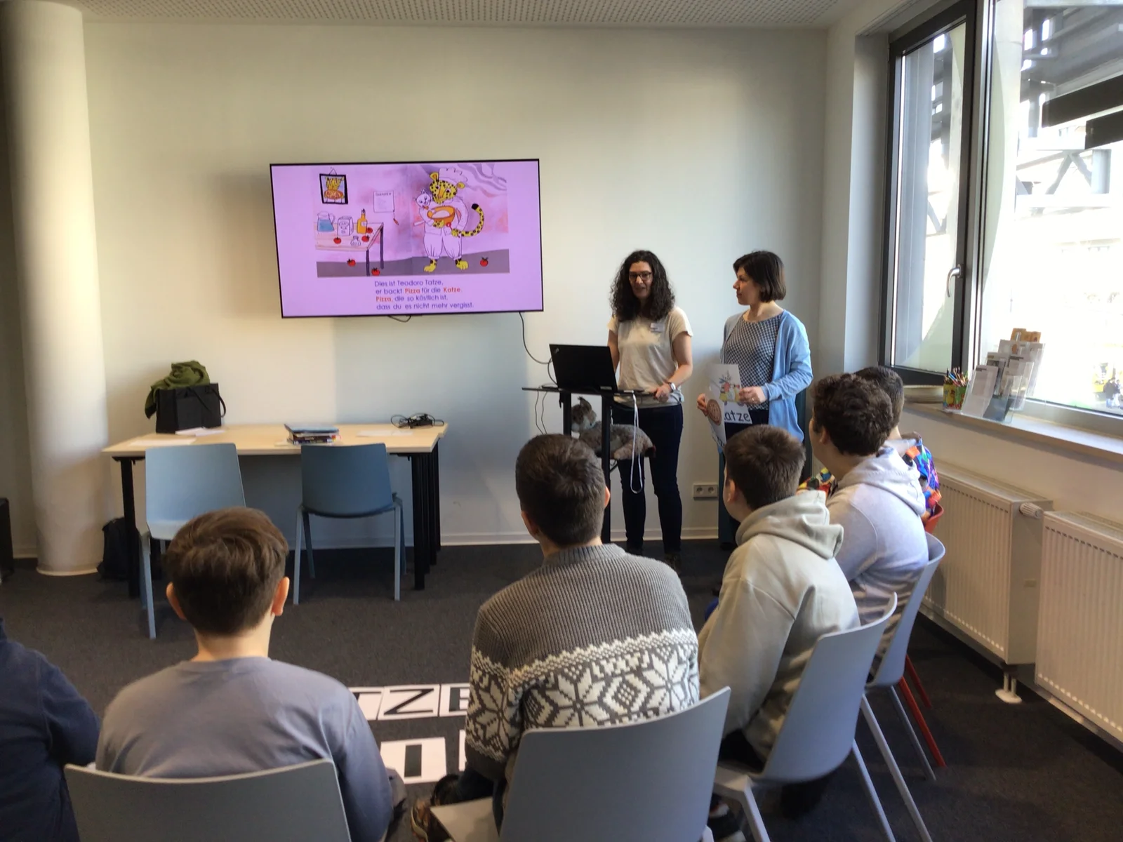 Sie haben Lesekaraoke gemacht. Die Lesekaraoke heißt Pizzakatze. Frau Rohrer hat eine Führung gemacht. Man muss leise sein und schleichen in der Bibliothek. Wenn man nicht weiß wo ein Buch hingehört, dann kommt es in das rote Regal. Die Klasse war im Kinderbereich und hat sich Bücher ausgeleihen und es sich dort gemütlich gemacht!
