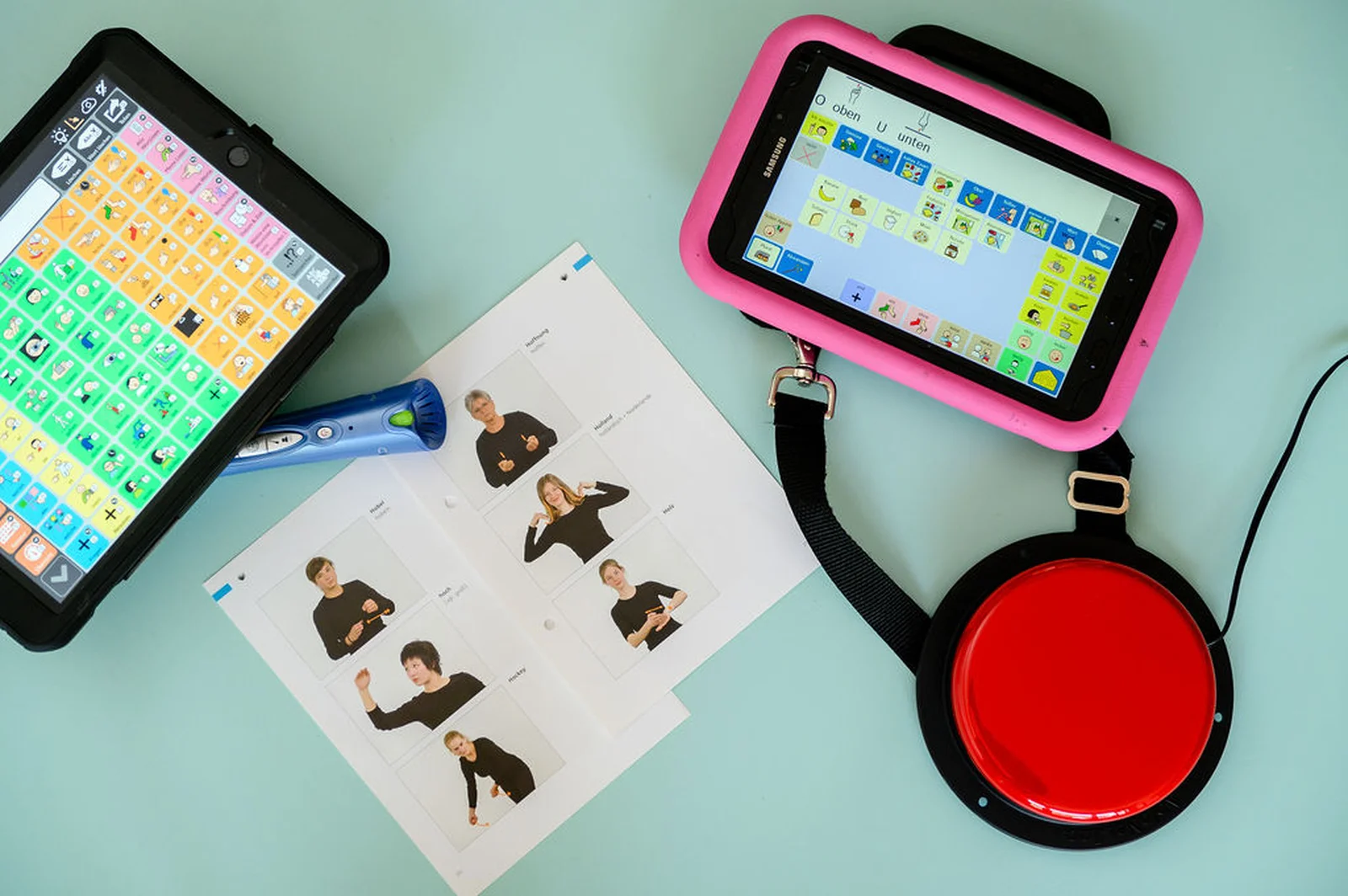 Auch im technischen Bereich der Kommunikationshilfen findet man bei uns sowohl ganz einfache Sprachausgabegeräte bis hin zu komplexen Talkern. Auch Tablets unterstützen unserer Schülerinnen und Schüler in vielfältiger Art und Weise.