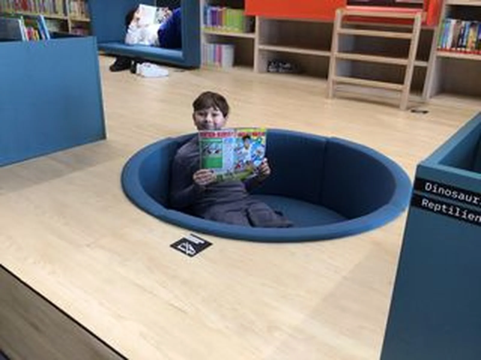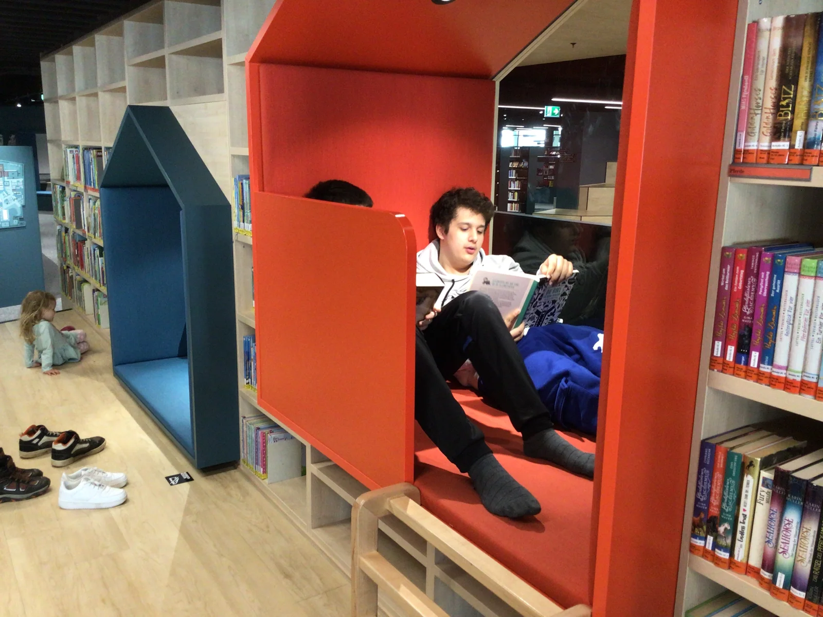 Sie haben Lesekaraoke gemacht. Die Lesekaraoke heißt Pizzakatze. Frau Rohrer hat eine Führung gemacht. Man muss leise sein und schleichen in der Bibliothek. Wenn man nicht weiß wo ein Buch hingehört, dann kommt es in das rote Regal. Die Klasse war im Kinderbereich und hat sich Bücher ausgeleihen und es sich dort gemütlich gemacht!